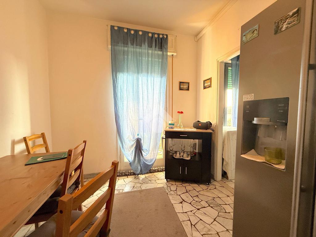 La zona living si compone di un ampio soggiorno, attualmente utilizzato come camera, collegato alla sala da pranzo con cucinotto separato. Da entrambi gli ambienti si accede al terrazzo, ideale per momenti di relax e caratterizzato da una gradevole vista aperta sui tetti del quartiere.
